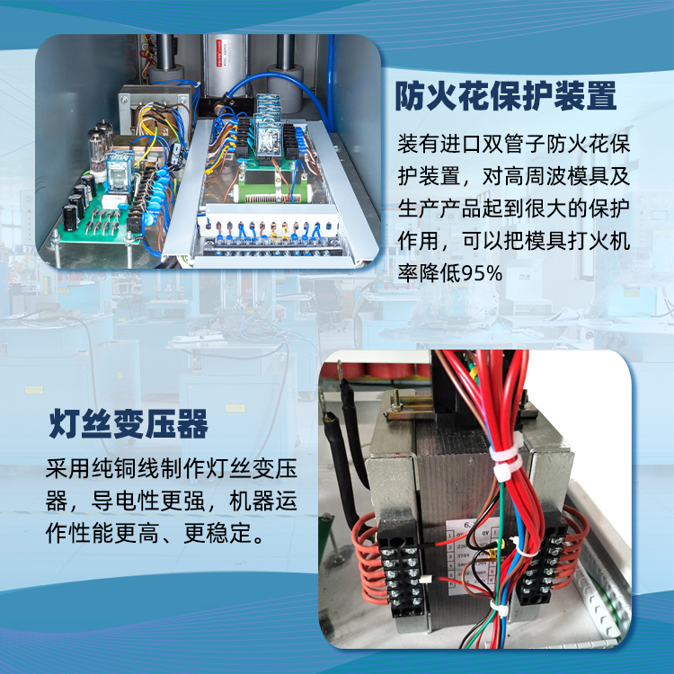 汽車腳墊單邊推盤高周波機(jī)高靈敏度進(jìn)口雙管火花保護(hù)裝置,能有效保護(hù)模具及產(chǎn)品的缺損,從而大大減少燒壞模具的機(jī)率,采用國際大品牌原裝OMRON(歐姆龍)繼電器及臺灣正宗CKC時(shí)間制,能保證機(jī)器長時(shí)間的頻率工作,并大大延長機(jī)器壽命,減少機(jī)器故障。